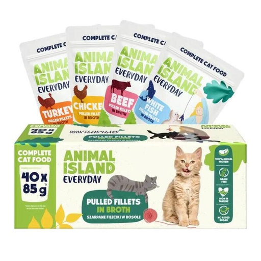 Comida Húmeda Para Gatos Animal Island Filetes De Carne, Pollo, Pavo Y Pescado Blanco En Caldo 40 X 85g