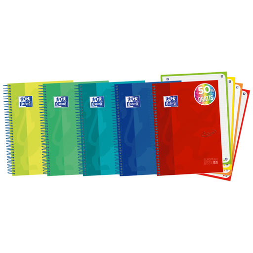 Pack De 5 Unidades Oxford Europeanbook 4 Cuaderno Espiral Formato A5+ Cuadriculado 5x5mm - 120 Hojas - Tapa Extradura Acabado Brillante - 4 Bandas De Color - Colores Surtidos
