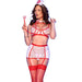 Atrevida, juguetona y deliciosamente traviesa, ese es el tipo de enfermera que entra en este sensual conjunto. Un sujetador sexy con cuello incorporado y cremallera frontal revela sutilmente el busto, mientras que los detalles en rojo aumentan la temperatura